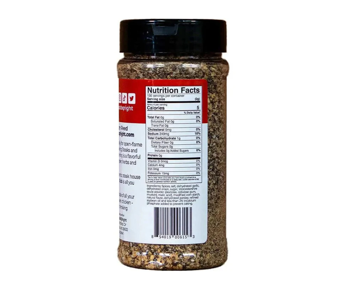 Ingredients: Spices (red and black pepper), salt, dehydrated garlic, dehydrated onion, sugar, Worcestershire sauce powder (dextrose, cellulose gum, mustard, malic acid), modified corn starch, natural flavor, dehydrated parsley, refined soybean oil and less than 2% tricalcium phosphate added to prevent caking.