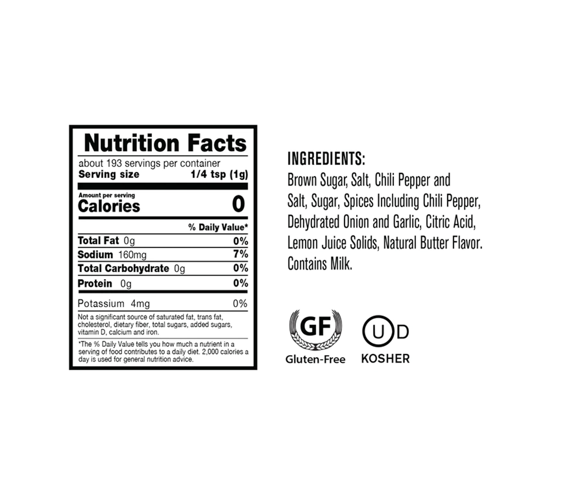 Ingredients: Brown Sugar, Salt, Chili Pepper, Sugar, Spices including Chili Pepper, Dehydrated Onion and Garlic, Citric Acid, Lemon Juice Solids, Natural Butter Flavor. Contains Milk.